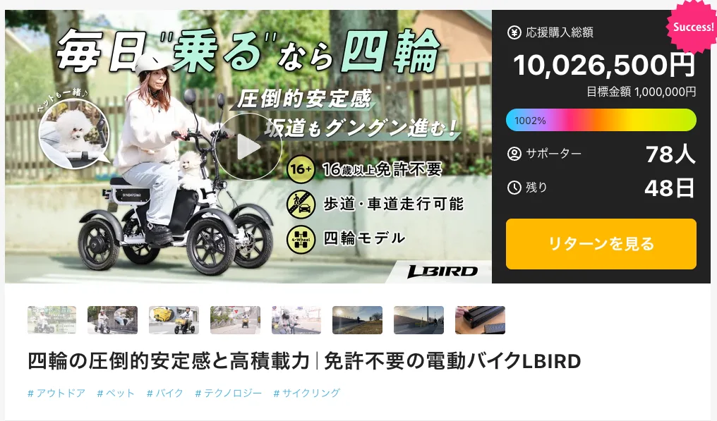 Sun Emperorブランド初の4輪特定小型原付「LBIRD」がMakuakeで公開直後に応援購入総額1,000万円を突破しました。過去の2輪・3輪モデルの実績と、日常の困りごとを解決する実用的なスペックが支持を集める背景を読み解きます。